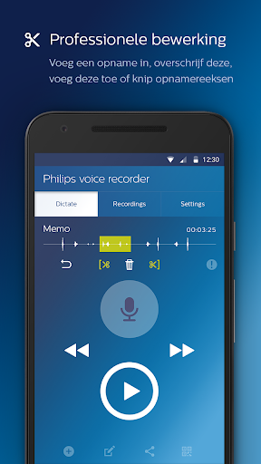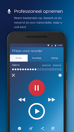 De Philips voice recorder app biedt uitstekende opnamekwaliteit, professionele functies zoals het invoegen of knippen van bepaalde sequenties en een intuïtieve bediening. Opnames kunnen eenvoudig verstuurd worden via e-mail, Dropbox, Google Drive, enz. Voor maximale beveiliging, browser-gebaseerd bestandsbeheer en bijkomende services zoals spraakherkenning, kunnen we het gebruik van onze handige Philips SpeechLive service aanbevelen.
