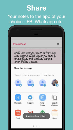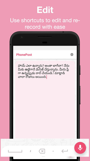 Telefoon Post is een gratis spraak typen toetsenbord-app. Het is snel en veilig en maakt het eenvoudig om lange berichten in elke taal samen te stellen. Probeer dus telefoonpost en stel berichten samen met je stem naar je vrienden en familie in Telugu (తెలుగు), Hindi (हिंदी) enz! Telefoonpost kan worden gebruikt om berichten in WhatsApp te verzenden, statusberichten in Facebook samen te stellen of blogartikelen in Telugu / Tamil / Hindi te schrijven.