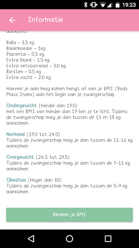Hoeveel je aan mag komen hangt af van je BMI (Body Mass Index) aan het begin van je zwangerschap. Je BMI kan je berekenen met een handig hulpmiddel in de app. Vervolgens krijg je een advies hoeveel je ongeveer aan mag komen gedurende je zwangerschap.
