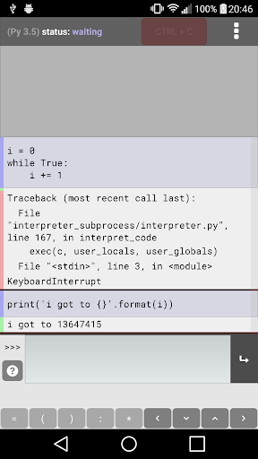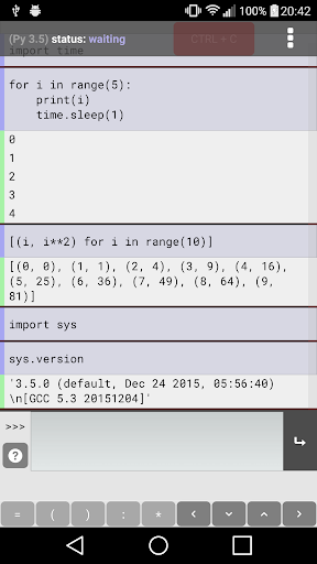 Pyonic interpreter is a graphical interface to the Python programming language interpreter. You can run Python code and see the results just like on the desktop, with some user interface enhancements for mobile usage including additional keyboard buttons, autocompletion and doc query.