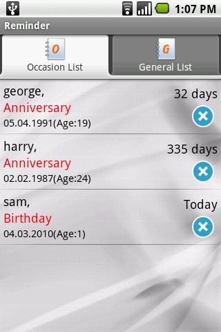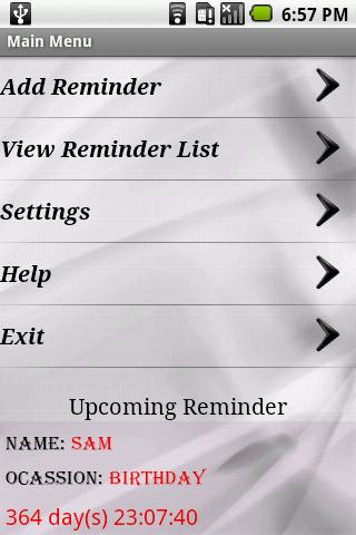 The applications serves you A a reminder for occasions like birthday,anniversary..etc, and also as daily reminder displays Number of days left Countdown timer for both occasional and daily reminder easy to usePlease post your commentsversion 1 0 1:minor bug fixes and ui changes