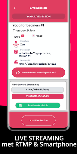 Als instructeur blijf je TINA gebruiken. Nu kunt u uw live sessies plannen en streamen om te worden gezien op de TINA.FIT-webportal. Het webportaal wordt door de fitnessfans gebruikt om thuis te trainen en te communiceren met de instructeur. Fitnessfans kunnen zich registreren en betalen om uw sessies bij te wonen en u krijgt een deel van die inkomsten.