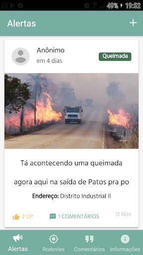 - Notificações sobre incidentes no trânsito, incluindo acidentes envolvendo carros, animais silvestres, animais domésticos; queimadas; alagamentos, dentre outros que o usuário ache inapropriado;