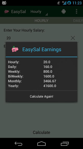 EasySal Calculator is a simple salary calculator that calculates ones salary based on United States money. This application can calculate hourly, daily, weekly, biweekly, monthly and yearly wages.