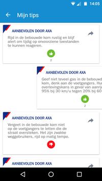 Of uw score hoog was of ... eigenlijk niet zo hoog ... AXA Drive stuurt u - om u op de goede weg te zetten - een gepersonaliseerde ’veilig rijden‘-tip. Hoe kunnen tips worden gepersonaliseerd? We houden rekening met uw score, de aard van de wegen, de weersomstandigheden, de lengte van de rit en of u tijdens de dag of nacht reed. Ons doel is u te helpen leren!