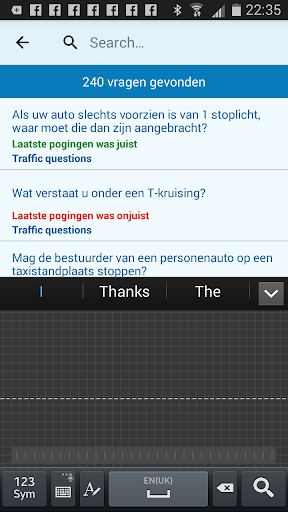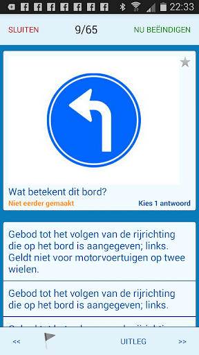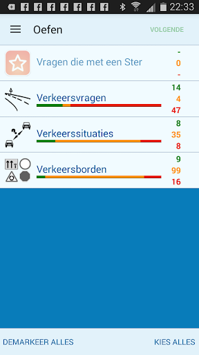 Registreert uw vorderingen, zodat u kunt zien hoe het met u gaat en wanneer u er klaar voor bent. Bewaart moeilijke vragen om later of vlak voor uw theorie-examen opnieuw te bekijken.