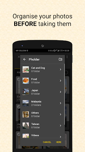 Before taking any photo / video, choose the folder to save your media. Pholder also supports sub-folders, so you can categorise your picture as much as you want! Move your photos from folder to folder easily!