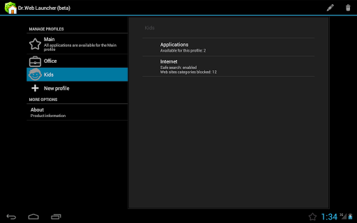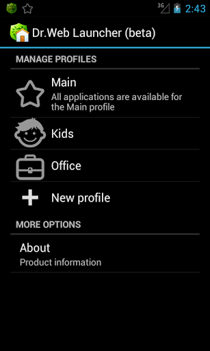 Dr.Web Launcher is a secure interface designed to protect the users of the mobile devices working under the Android™ operating system from using some of the installed applications and viewing the undesirable web sites.Dr.Web Launcher performs the following functions:• Creating separate list of the available applications for each user of the mobile device• Easy switching between users• Adding widgets to access the device functions and installed applications• Use of a special safe Dr.Web browser • Protection from viewing the undesirable web resources by blocking the users access to a number of categories of not recommended and potentially dangerous web sites (known sources of viruses, gambling, drugs, social networks terrorism, adult content etc.)