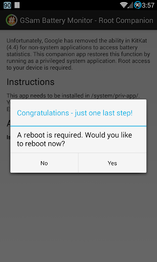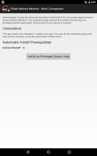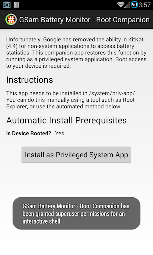 Helaas heeft Google de mogelijkheid (Kitkat 4.4 en hoger) verwijderd voor niet-systeemtoepassingen om toegang te krijgen tot de batterijstatistieken. Deze Companion-app herstelt deze functie door te draaien als een bevoorrechte systeemtoepassing. Root-toegang tot uw apparaat is vereist. GSAM-batterijlonitor werkt prima zonder de wortelgenoot, maar deze app voegt extra statistieken toe.