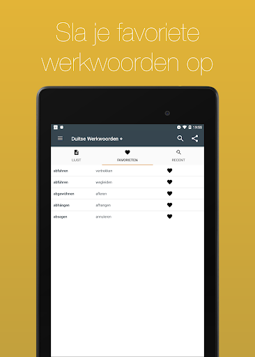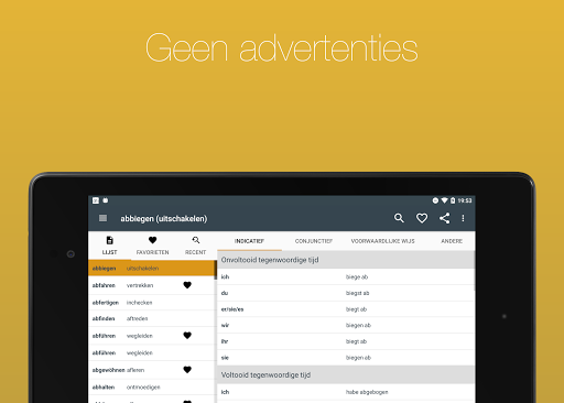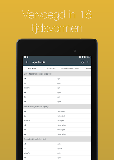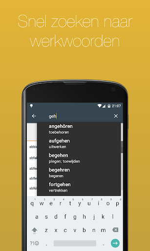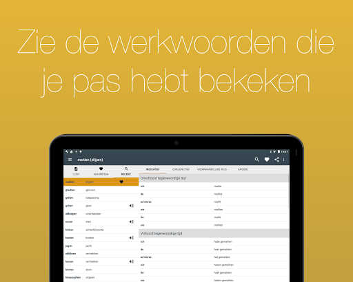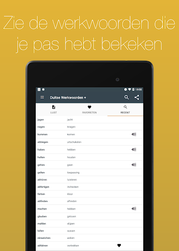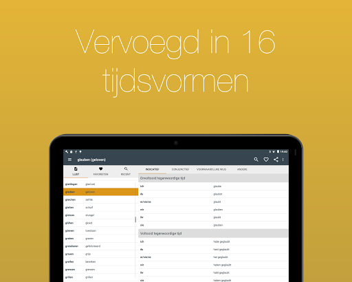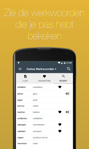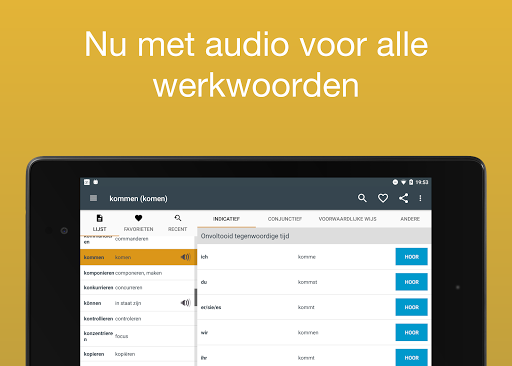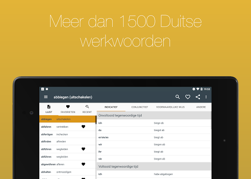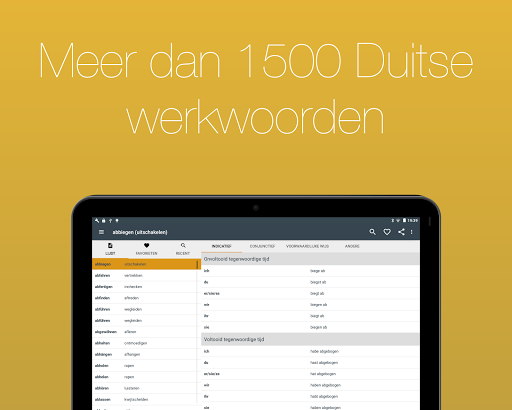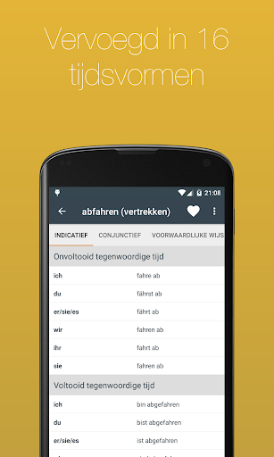 Bekijk meer dan 1500 Duitse werkwoorden in 16 tijden. Met eenvoudige navigatie en ingebouwde zoekfunctie, kun je het werkwoord dat je nodig hebt binnen seconden vinden.