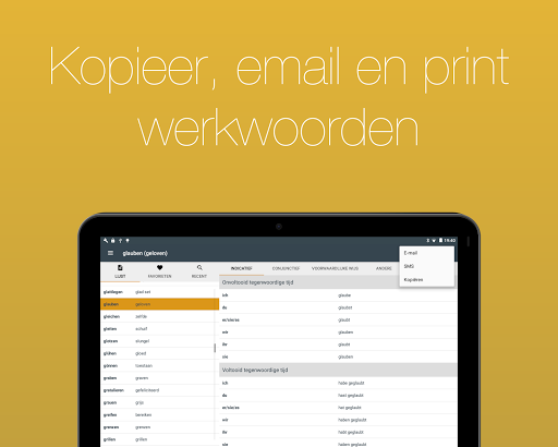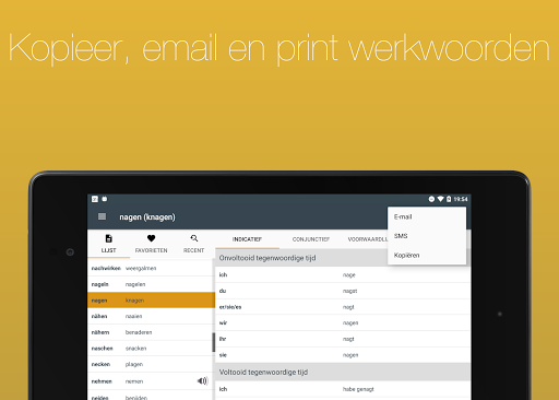 Biedt de mogelijkheid om werkwoorden te kopiëren, e-mailen en printen.