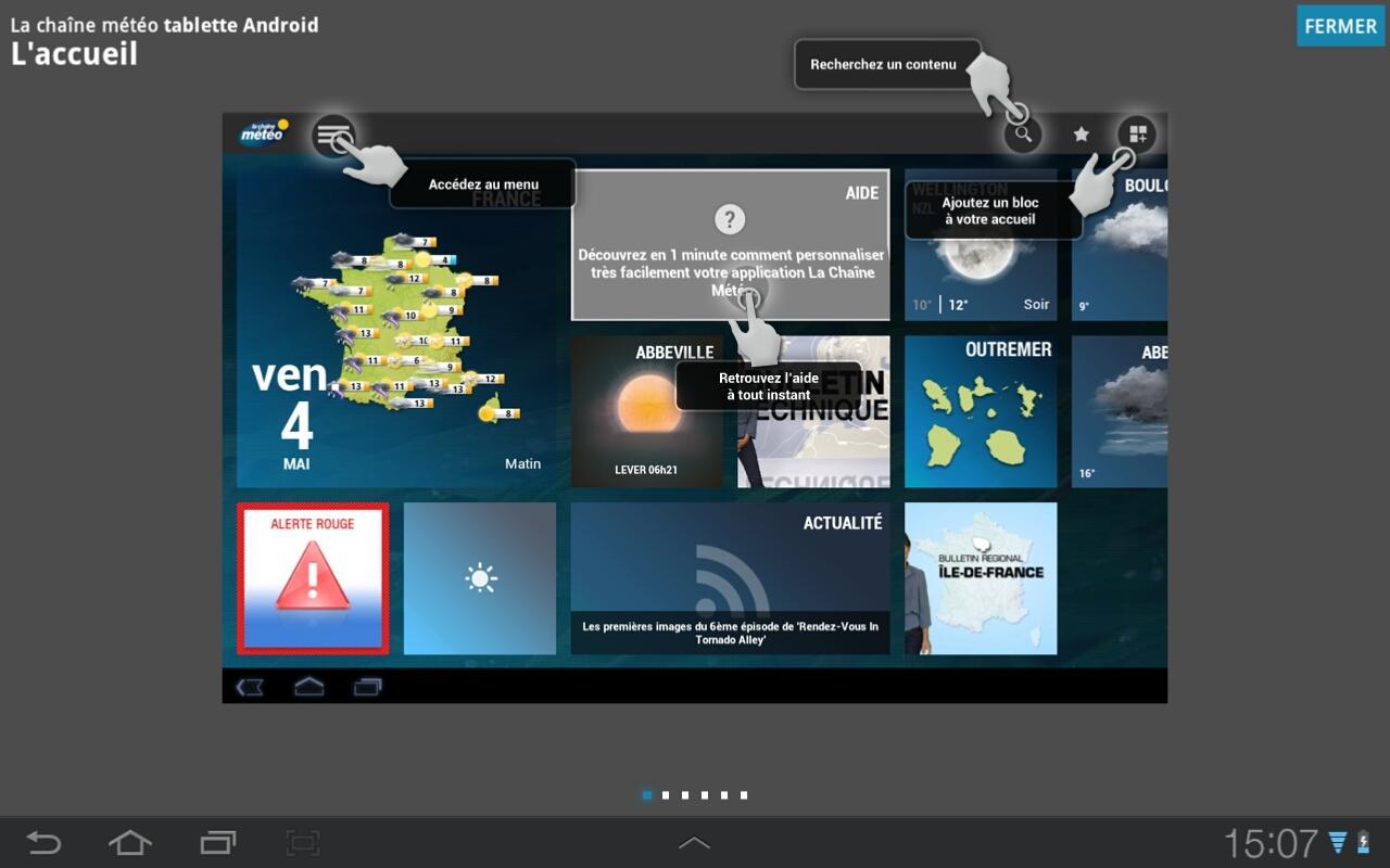 En fonction de vos goûts et de vos envies, ajoutez sur l’écran d’accueil de votre Chaîne Météo Tablette, l’ensemble des contenus présents dans l’application. D’une simple pression, détachez les contenus pour les bouger, les agencer comme vous le souhaitez, ou les supprimer.