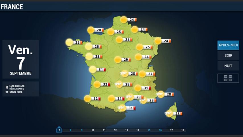 Grâce à l’ergonomie proposée, accédez à toutes vos prévisions de façon simple, rapide et ludique. Une pression sur la carte de France vous permet de visualiser la carte régionale choisie, puis la carte départementale et pour finir la prévision de la ville : 4 niveaux de prévisions, pour quatre fois plus de précision. D’un simple slide, changez d’échéance !