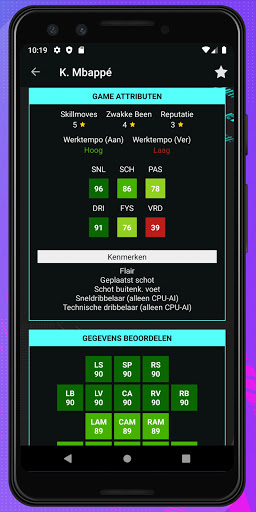 In het scherm Spelerinformatie kunt u erg gedetailleerde informatie bekijken zoals Foto, Naam, Voorkeursposities, Beste voet, Geboortedatum, Lengte, Gewicht, Vervaldatum contract, Salaris, Waarde, Meet-or-release clausule, Specialiteiten, Kenmerken, Zwakke voet, Vaardigheden, Ziekteverzuimpercentage en Spelerbeoordelingen per positie.