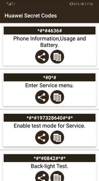 In All Huawei Secret Codes for mobile you can find all common android secret codes include Network, GPS, Bluetooth, WLAN test, Firmware version information, factory tests, PDA, display the IMEI number, Super Mode, Service Menu, Check Update, Reset Device, Unlock the device, Recover Forgotten pattern, Engineering mode, GPS test mode, Machine information, Software Information, Hardware Information, Test Photograph RGB and much more. Now You can Discover the secret world of your Android base mobile devices. Some code of them may not work on specific devices, but you can still try them because their manufacturer does not allow them. When those codes are typed manually from the phone dialer or you can copy this code with long press on code and paste it on clipboard. There is also Functionality in the Huawei Secret Codes to share it with Social Apps free and offline.