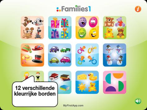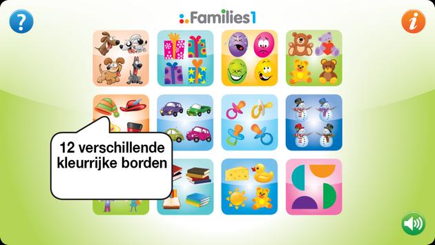 In Families 1 zijn de gezinnen opgemaakt uit 4 afbeeldingen die op elkaar lijken, maar een kleine visuele variatie vertonen. Dit is ontworpen voor kinderen van 2 .