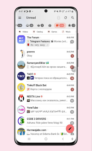 • gescheiden tabbladen voor chats: gebruikers, groepen, kanalen, bots, favorieten, ongelezen, admin/maker.