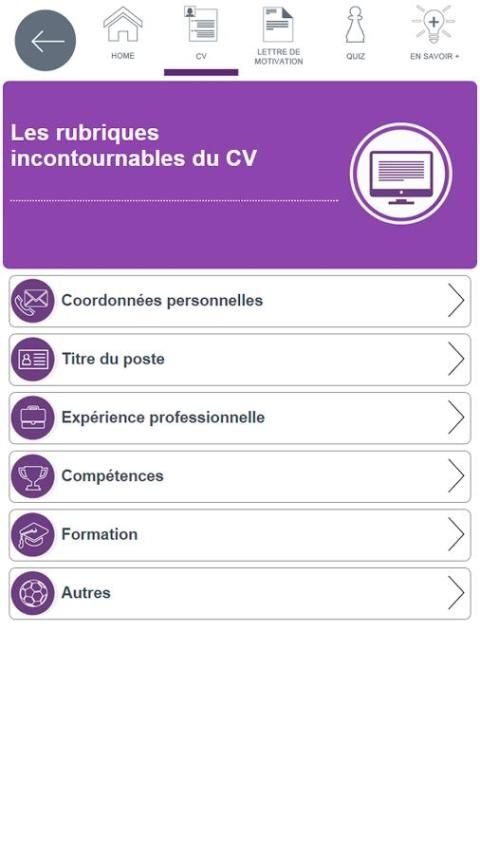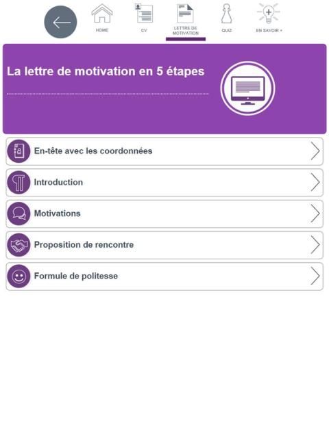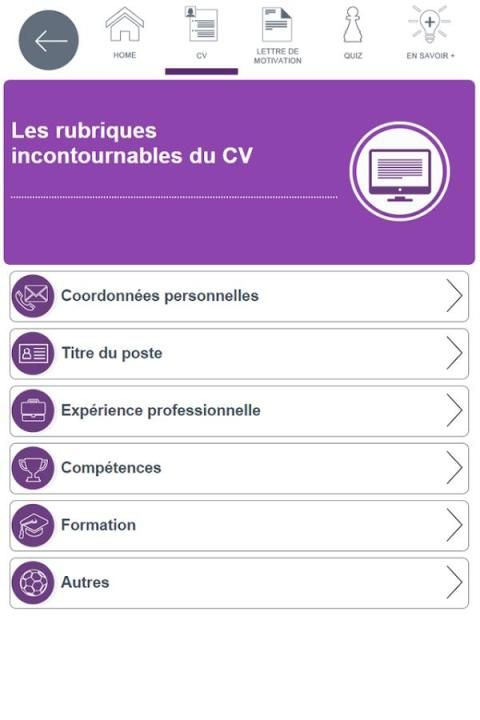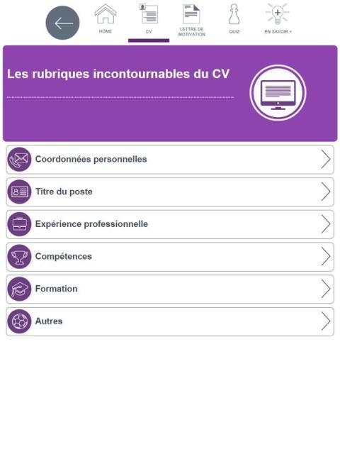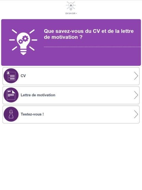 L’application CV LM est un B.A.BA de la recherche d’emploi qui vous permet de voir et revoir les essentiels du CV et de la lettre de candidature. Au travers d’une navigation simple et claire d’une durée d’une vingtaine de minutes vous pourrez également tester vos connaissances sur ces fondamentaux.