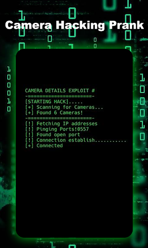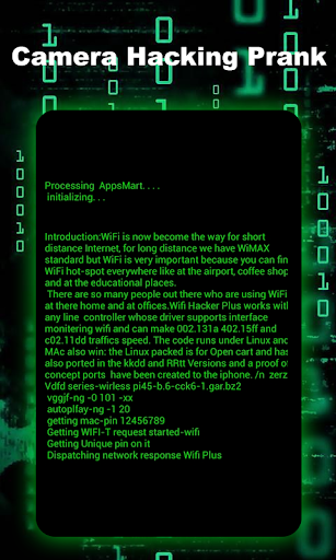 How does it work? "Camera hacking prank" shows you a text area and on your command of the "hack" button will being the "hacking", with hack text being typed out!