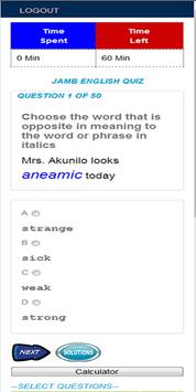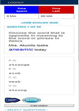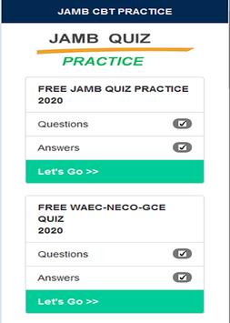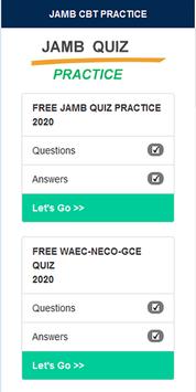 JAMB , WAEC , NECO , GCE Quiz practice is an online test engine that aims at promoting academic excellence and performance amongst candidates preparing for Joint admissions and matriculation examinations and other exams .It provides an online exam simulation where candidates are subjected to the real examination situation.Users can use either the PRACTICE MODE OR LIVE MODE and also have control over the timing of the test. At the end, the result is displayed along with the Questions Passed and Questions Failed and option to start a fresh test.