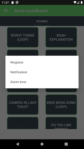* Set Borat sounds as ringtone, alarm or notification tone.