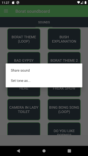 Borat soundboard application contains various sounds of Borat. Also you can set as ringtone, notification tone or alarm tone these Borat sounds. Enjoy it