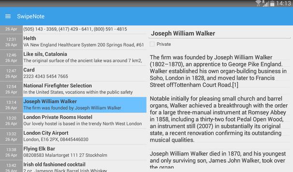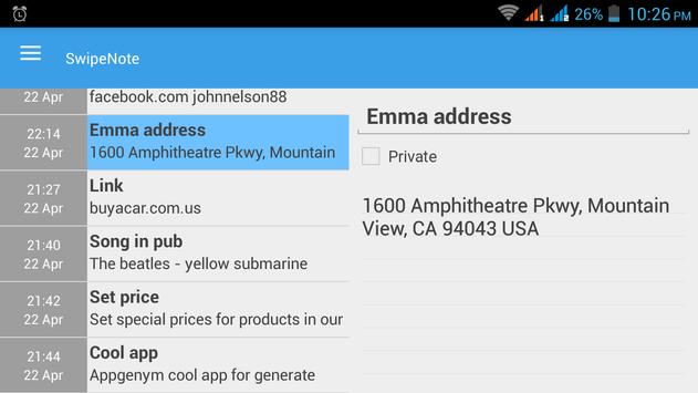 Simple and easy application to create and store your notes. Thanks to the module private notes in SwipeNote you can store personal records password protected.