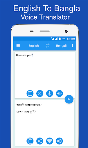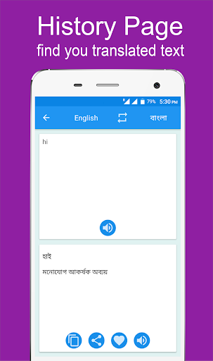 এবং বাংলা থেকে ইংরেজীতে (Bengali to English translator) যে কোন বাক্য বা শব্দ অনুবাদ করতে সহায়তা করবে। আপনি চাইলে কথা বলে তা অনুবাদ করতে পারবেন। অ্যাপটিতে সম্পূর্ন বাংলা এবং ইংরেজী ট্যান্সলেটর রয়েছে।