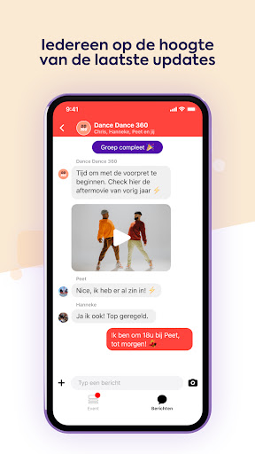 Hoe laat moeten jullie er zijn? Waar te parkeren? Welke maatregelen gelden? Geen stress! In de app staat alle relevante event informatie overzichtelijk op een rijtje. Iedereen in de groep ontvangt updates en handige reminders.