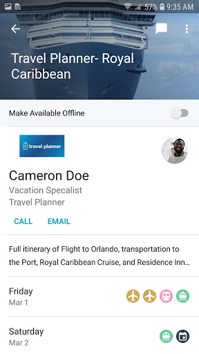 Na het plannen van uw droomuitje met uw vakantiegraad, sturen ze u een reisroute voor Elke reis die ze boeken op compleet met alle relevante details en hun contactgegevens. Je hebt een record voor alle reisplannen, waaronder: Shore-excursies, tourgegevens, restaurantsreserveringen, accommodaties, vertrek, aankomsten en alles wat u en uw vakantiegangsspecialist hebben gepland voor uw geweldige uitje. Uw vakantiespecialist biedt de informatie over hotels, vluchten, cruises, restaurants, bezienswaardigheden en meer! Routes worden gesynchroniseerd in deze app, zodat u ervoor kunt zorgen dat u op tijd bent om elke keer een geweldige tijd te hebben.
