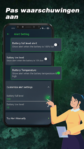 Informatie over de batterijstatus. Apparaatinfo biedt belangrijke apparaatgegevens, terwijl aangepaste apparaatmeldingsinstellingen op maat gemaakte meldingen mogelijk maken. Bovendien houden waarschuwingsmeldingen u op de hoogte van het batterijniveau.