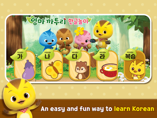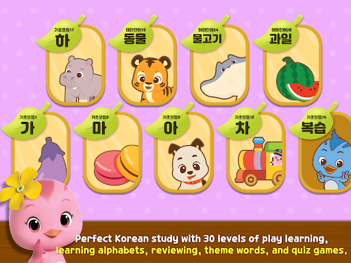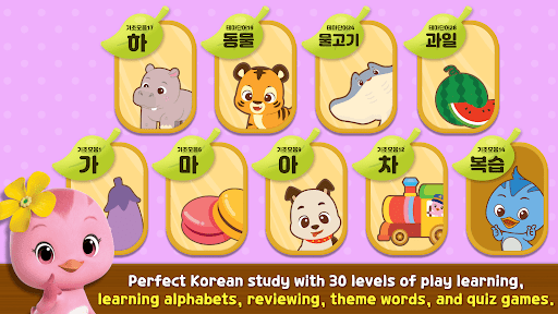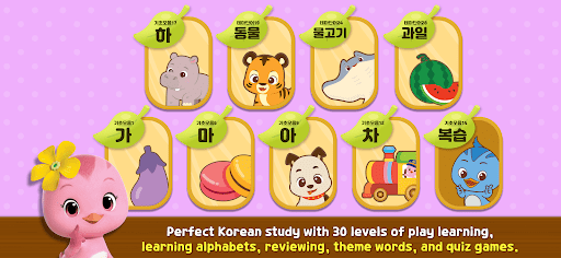 Perfect Korean study with 30 levels of play learning, learning alphabets, reviewing, theme words, and quiz games.