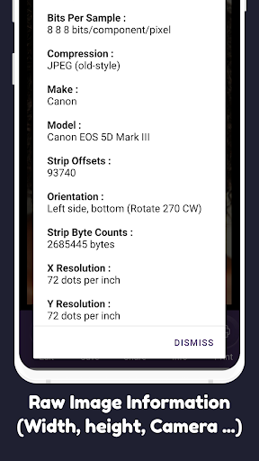 U kunt deze app gebruiken om een afbeelding van een afbeelding te controleren: onze onbewerkte beeldviewer geeft de gebruiker de beeldeigenschappen zoals de X -resolutie, software, afbeelding maken, datum en tijd van de afbeelding, wit punt, beeldhoogte enBreedte, bits per monster, compressie, fotometrische interpretatie, strip offset, belichtingstijd, F-nummer, ISO-snelheidsbeoordelingen, brandpuntsafstand, EXIF-beeldbreedte en hoogte, bestandsbron enz.