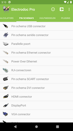 • Diverse pin schema's (Pin schema USB connector, Pin schema seriële connector, Parallelle poort, Pin schema Ethernet connector, Power Over Ethernet, RJ-connectoren, Pin schema SCART connector, Pin schema DVI connector, HDMI connector, DisplayPort, VGA connector, S-Video connector, VESA connector, Jack connector, FireWire connector, RCA connector, Audio DIN connector, XLR en DMX, ATX voeding connectors, PC connectors, EIDE/ATA - SATA, PS/2-AT connectors, 25-polig telefoon kabel kleurcode, Glasvezelkabel Kleurcode, MIDI connector, MIDI/Game poort, Apple 30-pins connector, Apple Lightning connector, PDMI, OBD-II Auto connector, Auto audio ISO plug, Trailer connectoren, Pin schema SD-kaart, SIM/Smart card, Pin schema Raspberry Pi, Pin schema LCD, Pin schema GPIB/IEEE-488, Thermokoppel kleuren, Arduino boarden, JTAG pinouts, BeagleBone borden);