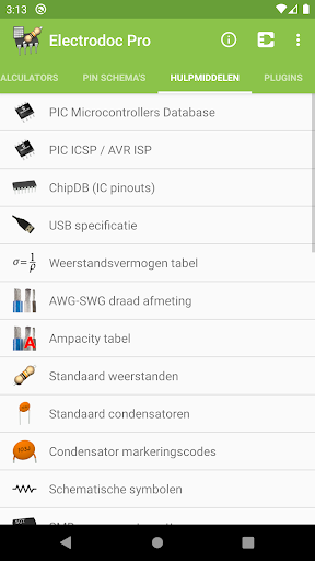 • Bronnen (PIC ICSP / AVR ISP, ChipDB (IC pinouts), USB specificatie, Weerstandsvermogen tabel, AWG-SWG draad afmeting, Ampacity tabel, Standaard weerstanden, Standaard condensatoren, Condensator markeringscodes, Schematische symbolen, SMD componentgrootte, Symbolen en afkortingen, SI eenheden voorvoegsels, ASCII Tabel, Boolean Logische poorten, 7400 series IC, Schakelaar Informatie, 78xx IC, Batterijen, Muntbatterijen, Decibel Tabel, Radiofrequenties, PT100 omrekentabel, Zekering kleur code, Auto zekering kleuren, DIN 47100 kleur codering, IP markering, Wereldstekkers/Stopcontacten, IEC connectors, NEMA connectors);