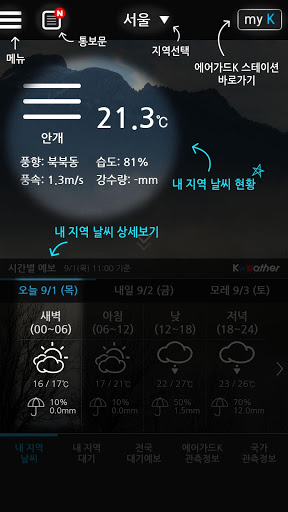 4. Gebiedsvoorspelling: de voorspelling-functie van Kaywether. Biedt een verscheidenheid aan atmosferische prognoses van fijn stof, temperatuur / boven, vochtigheid en neerslag.