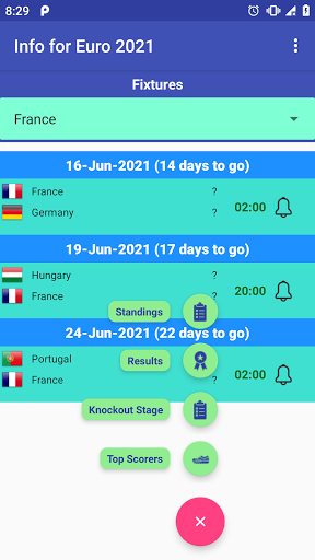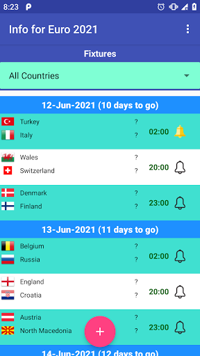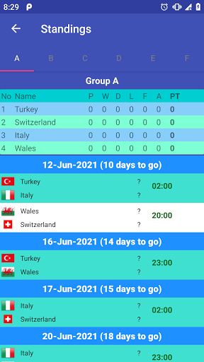 Krijg informatie voor Euro Cup 2021 - Match-armaturen en resultaten - Groepsstaanders - Doeleinden Top Scoorders - Set Alarm voor uw favoriete match - Toon het schema op landnaam