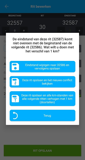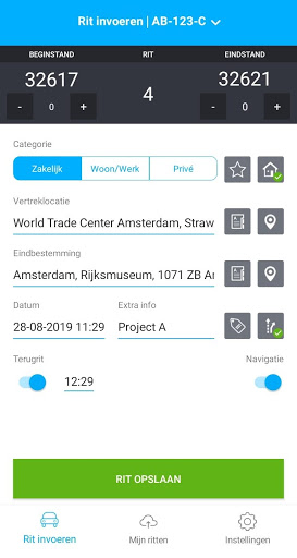 • Invoeren datum/tijd en begin- en eindstand van de kilometerteller
