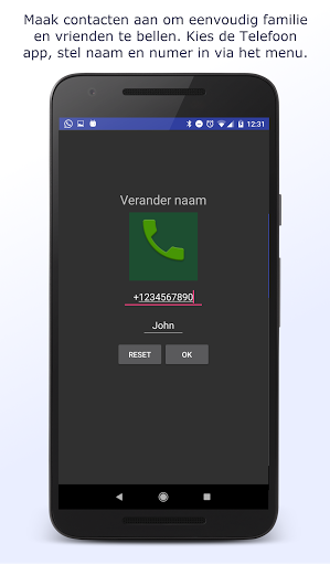 Om een contact toe te voegen, kies de groene Telefoon app. Dan in het menu, klik lang op de app, zo open je het settings menu. Stel naam en nummer in, de kleur is automatisch anders voor ieder contact.