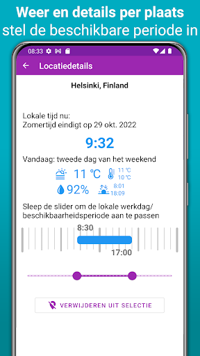 • Snel overlap zien in beschikbare uren tussen verschillende locaties waar ook ter wereld. En kijk hoeveel uur je nodig hebt om eerder te beginnen met werken of later te blijven. In elke set van vijf locaties kun je de “thuis” locatie verschillende begin- en eindtijden geven. Dit helpt je om te bepalen welke shifttijden je nodig hebt.