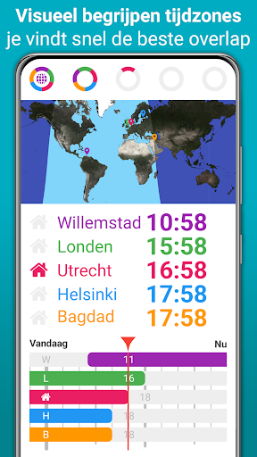 • Geen internet nodig: alle tijden worden berekend ten opzichte van jouw eigen tijd. Zorg ervoor dat je telefoon de juiste tijd heeft. En selecteer een stad met die lokale tijd als referentielocatie via het gekleurde thuispictogram.