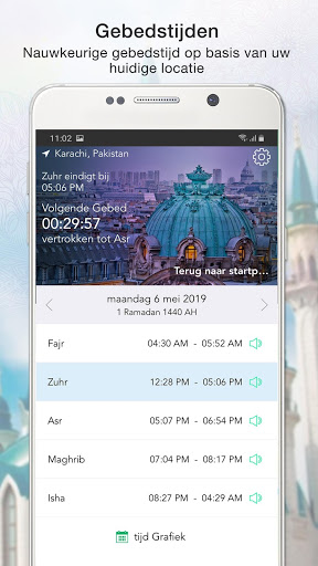 Je wordt op de hoogte gebracht met het geluid van de mooie Azaan wanneer de tijd van een gebed begint. U kunt gebedsalarmen instellen met prachtige azan-stemmen of standaard beltoon.