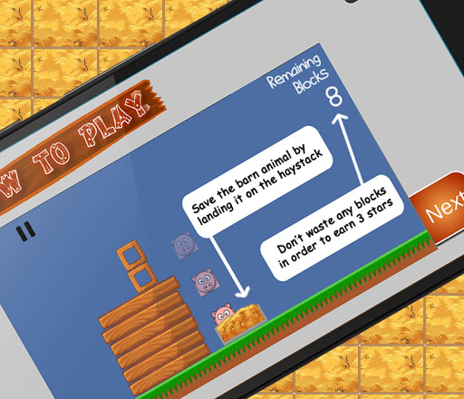 The barn animals are in trouble. They've been placed on towers of blocks and can't get down. Save them by destroying blocks and making sure they land safely on the hay.