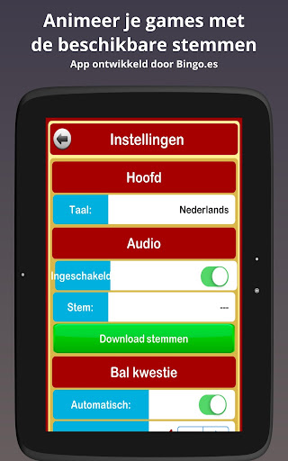 - Automatische modus: De app begint de bingoballen te roepen totdat gepauzeerd wordt of totdat er geen ballen meer zijn. De app maakt het mogelijk om de snelheid waarmee de ballen worden geroepen te configureren.