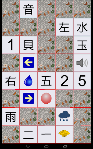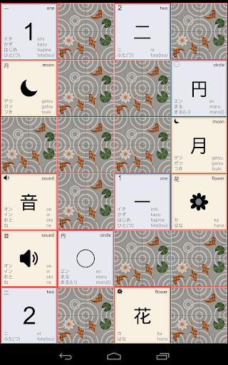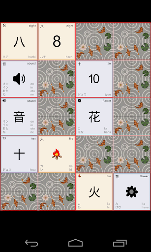Kanji-geheugen is een variatie waarin twee kaarten overeenkomen wanneer de Kanji en de Picture Match.Het beeld van het vuur komt bijvoorbeeld overeen met de Kanji 火 (HI).Door KANJI-geheugen te spelen, kunt u uw geheugen verbeteren, Japans leren KANJI en tegelijkertijd plezier hebben.