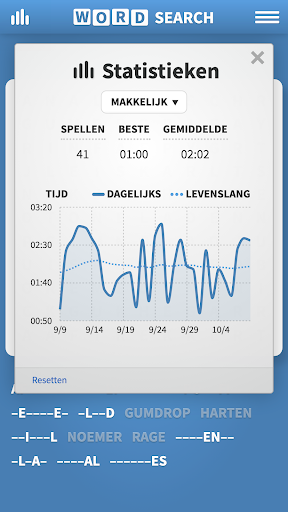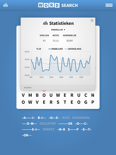 Ons klassiek Woordzoeker slaat eveneens uw niet-voltooide spellen op zodat u later weer terug kunt komen en het spel kunt uitspelen wanneer u maar wilt.