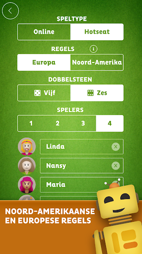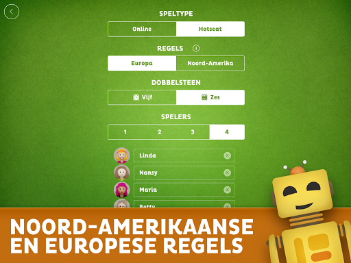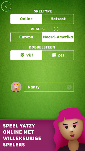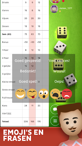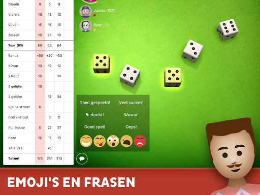 Speel Yatzy online met willekeurige spelers of met familie en vrienden. Ondersteunt zowel Noord-Amerikaanse als Europese regels, alsook 5 of 6 dobbelstenen. Yatzy laat tot 4 spelers online en offline toe en laat bots spelen tegen AI. Deel online mee in het plezier door tegen willekeurige spelers te spelen en toon dat jij de beste bent in Yatzy! Communiceer met andere spelers tijdens het spel met leuke emoji's en zinnen om Yatzy nog boeiender te maken!