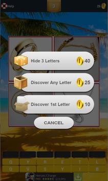If you were right in guessing there will be the addition of coins ( 15), if not there will be a reduction of the coin (-5). You can only make three errors in guessing (just had 3 ' lives '), if more then it will go back to the beginning of the game. If you stuck in the game you can use the three HELP that are available on the game. There are hide 3 letter, discover any letter, or discover 1st letter.