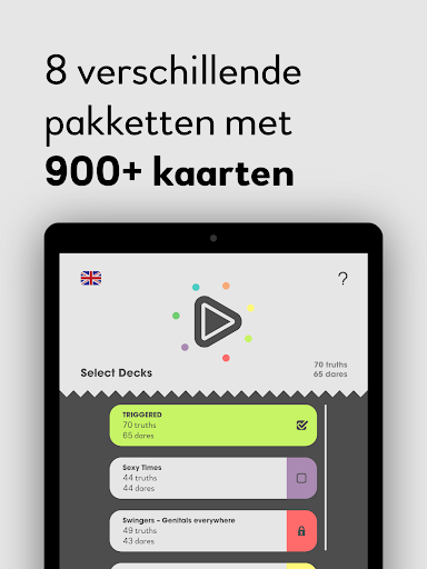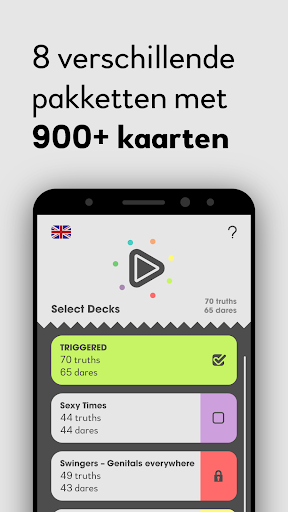 De zinnen/opdrachten zijn verdeeld tussen zes erg verschillende categorieën, er zijn meer dan 900 Waarheden of Opdrachten die je kan krijgen. Als je niet over vieze, sexy, relatie onderwerpen wilt praten (of ze doen), kan je deze pakketten gewoon uitzetten. Als je echt een gekke avond wilt, kan je ook de normale pakketten uitzetten. Kies je eigen avontuur!