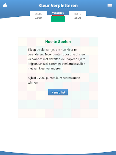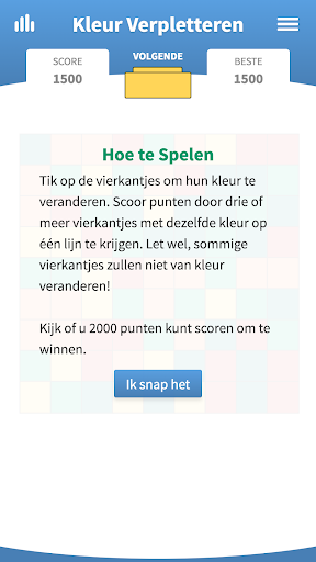 Het doel is om op zoveel mogelijk tegels te tikken en van het bord te halen. Het spel begint met een bord vierkante cellen gevuld met willekeurige kleuren. Tik op een cel om de kleur ervan te veranderen in de boven het bord aangegeven kleur. Er moeten drie of meer tegels met dezelfde kleur op één lijn verschijnen om ze te doen verdwijnen van het bord en punten te scoren. Als het bij de volgende tik niet mogelijk is om drie of meer aangrenzende tegels te laten verdwijnen dan is het spel afgelopen. Verbeter je strategie en laat het spel zo lang als je kunt doorgaan voor een hogere en optimale score. Kijk of je 2000 punten kunt scoren om te winnen. Let wel, niet alle cellen zullen van kleur veranderen.